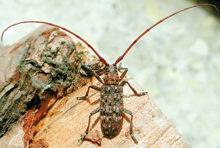 当松材线虫病的媒介昆虫繁殖产卵时,优先选择树木长势较弱的松树蛀孔产卵,而感染松材线虫的松树长势变弱,正好成为天牛理想的产卵场所。到天牛蛹羽化时,感病松树中的松材线虫通过天牛气孔侵入其呼吸系统,或附在天牛体表,随着羽化天牛在松林内迁飞寻找健康松树取食,就造成了松材线虫的传播扩散。一头松褐天牛成虫可携带数百至20余万条松材线虫。