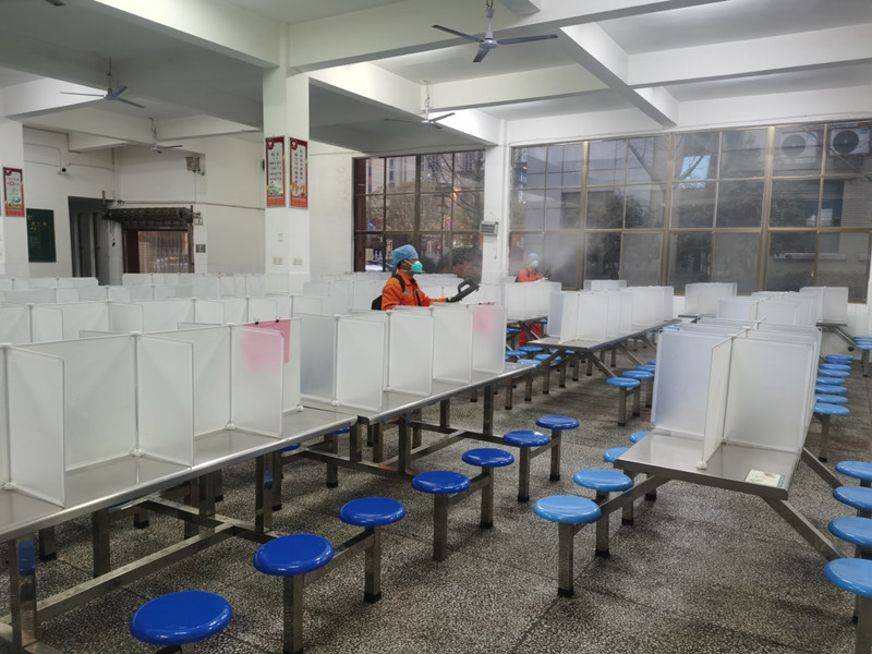 在区星城实验小学内,湖南通达生物科技有限公司的工人们穿着防护服,身背喷雾器,对教室、办公室、食堂等重点区域进行了专业、规范的环境消杀,确保不遗漏一个角落。